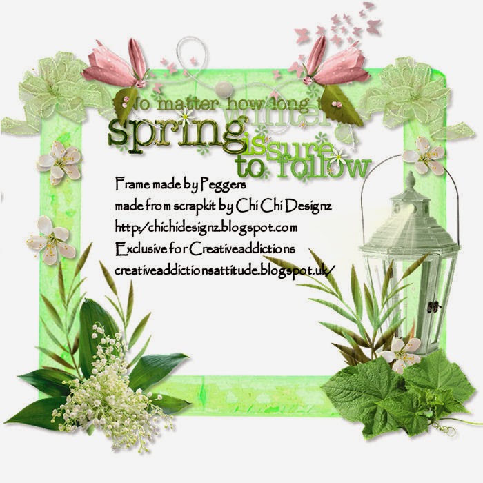 Creative Addictions we challenged our members to make Cluster Frames, Masks, Scrapkits, Templates and Wordart with the theme of Spring. Who is not ready for Spring? I know I am. The members came through with great work. We hope you will enjoy using all the great work. Thank you to Adele, Kittie, Les, Peggers and Squirrely! We appreciate your hard work very much!